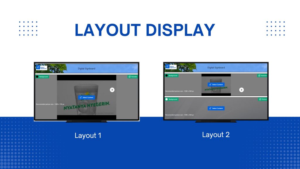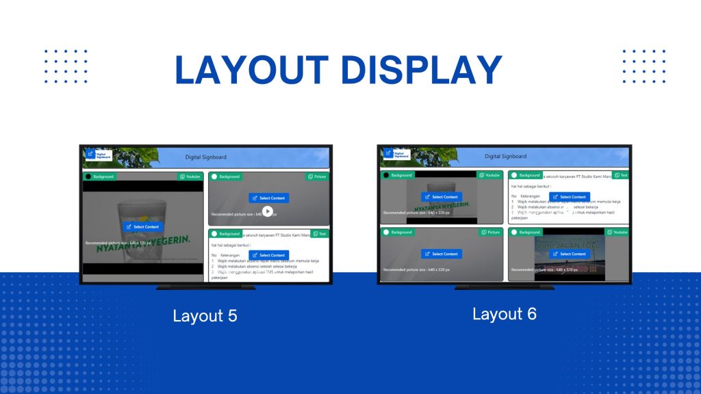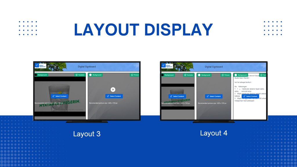 - Layout and Content Customization, the Digital Signboard application provides several layout views that can display the content you want to display on the Digital Signboard application.